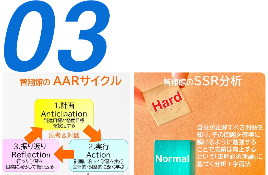 NBCテレビ「Pint!」でも紹介された智翔館独自の学習法「AAR(計画→実行→振り返り)サイクル」を体験。自分の中から意欲と能力が湧き上がる楽しさを実感してください。勉強には、お子様自身で能動的に取り組む姿勢(やる気)が非常に重要です。