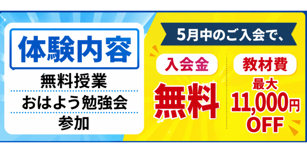 今だけ入会金無料と教材費が最大1,1000円OFF!5月入会キャンペーン