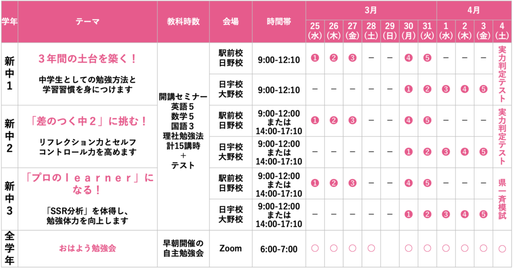 新中3:(午前)9時〜12時10分/(午後)14時00分〜17時10分(国・英・数+理社勉強法)