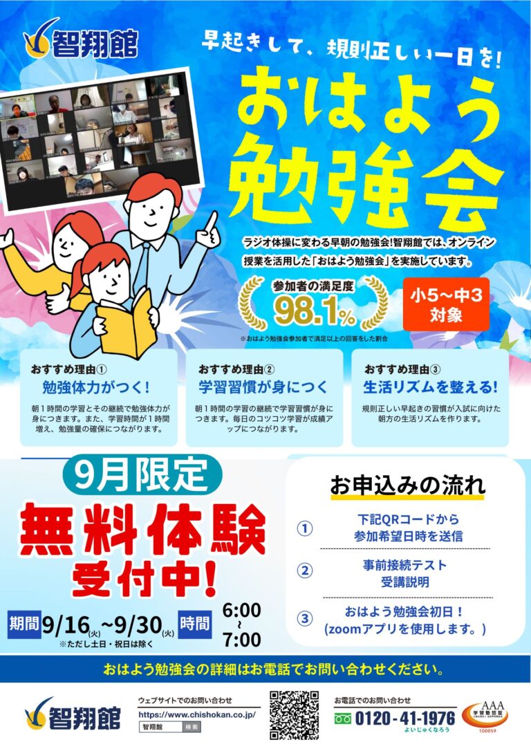こんにちは!日宇校の安田です。 いつも智翔館をご愛顧いただき、誠にありがとうございます。夏休みが終わ […] -
